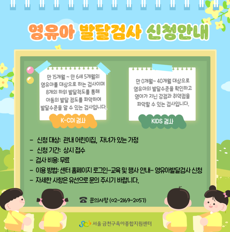 육아종합지원센터에서는 장난감 대여 뿐만아니라 위와같은 발달검사 등도 검사 비용 또한 무료로 진행해주고 있으니 아이를 키우시는 가정에서는 한번쯤 확인하셔서 장난감도 무료로 대여 받으시고 위와 같은 서비스도 놓치지 말고 필요하신 서비스가 있으면 바로바로 받으셨으면 좋겠습니다~