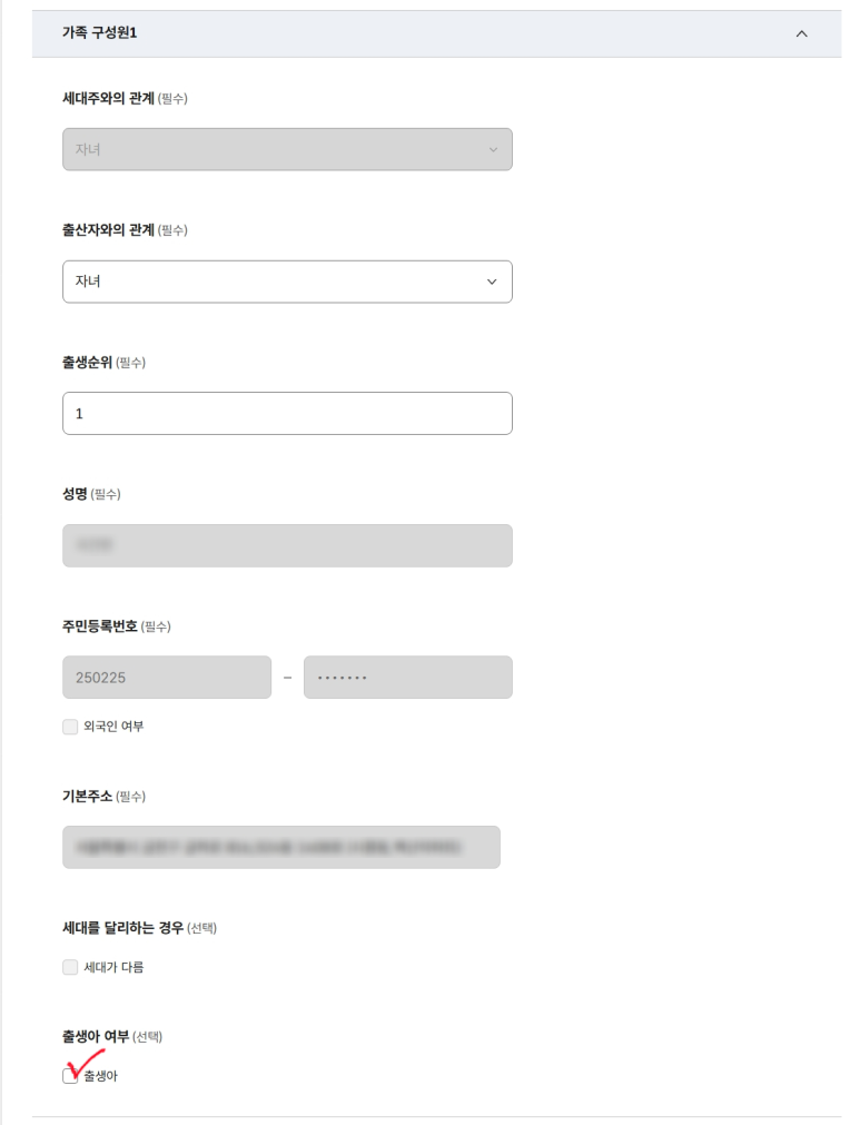 여기서 출생아 체크를 선택하시는 구간이 있는데 태어난 아기를 출생아 선택을 하셔야 3번으로 넘어가니 체크 후 다음으로 넘어가시면 됩니다 !