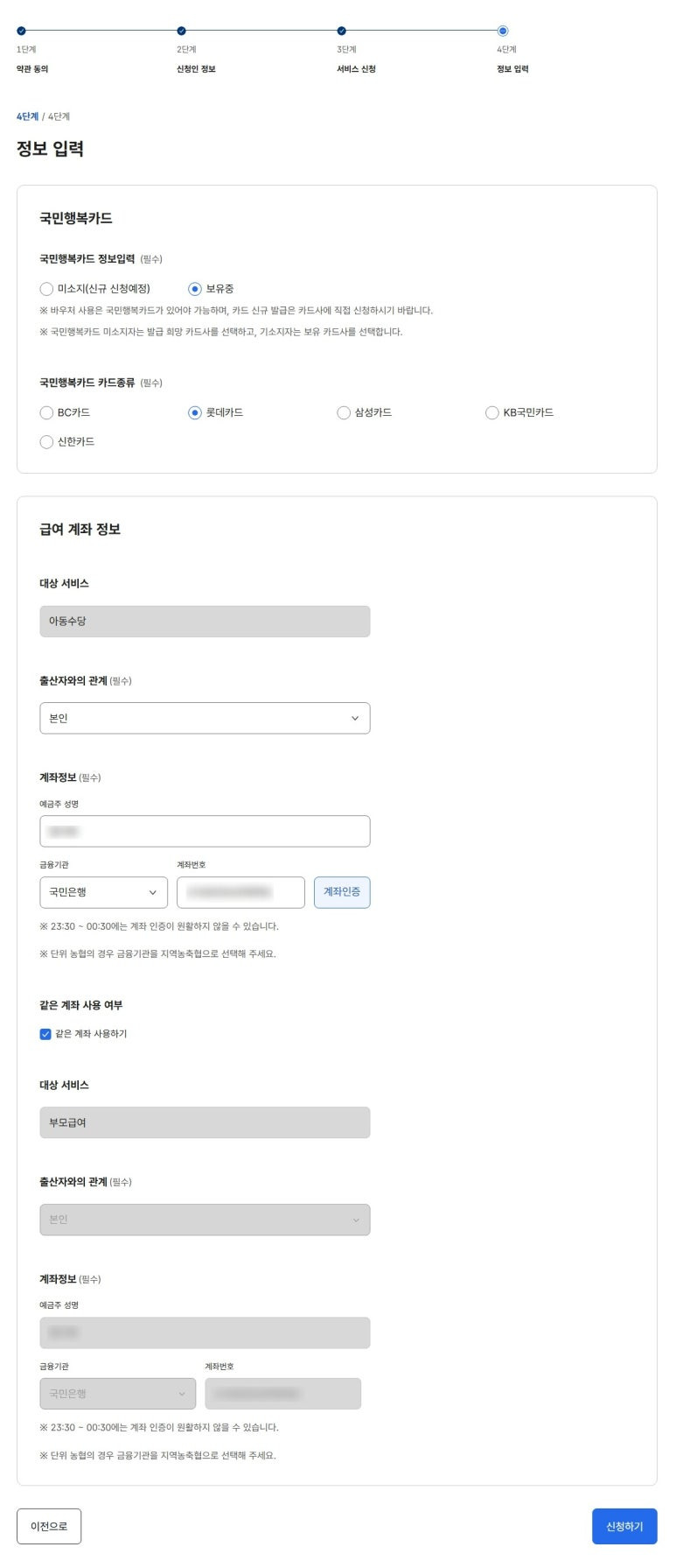 마지막 4단계에서는 보유중이신 국민행복카드 선택과 아동수당, 부모급여 받으실 계좌번호 입력 후 신청하기를 누르시면 신청 완료됩니다!