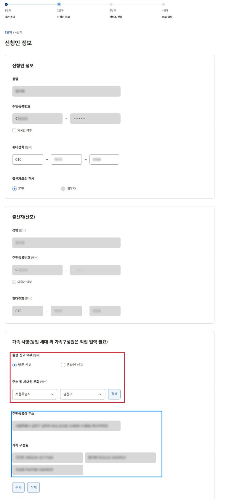 2단계에서는 신청인과 세대원 정보들을 선택하게 나오고 저와같이 방문신고를 하신 경우 방문 신고 클릭 주소 검색하시면 자동으로 아기까지 함께 나옵니다 :)