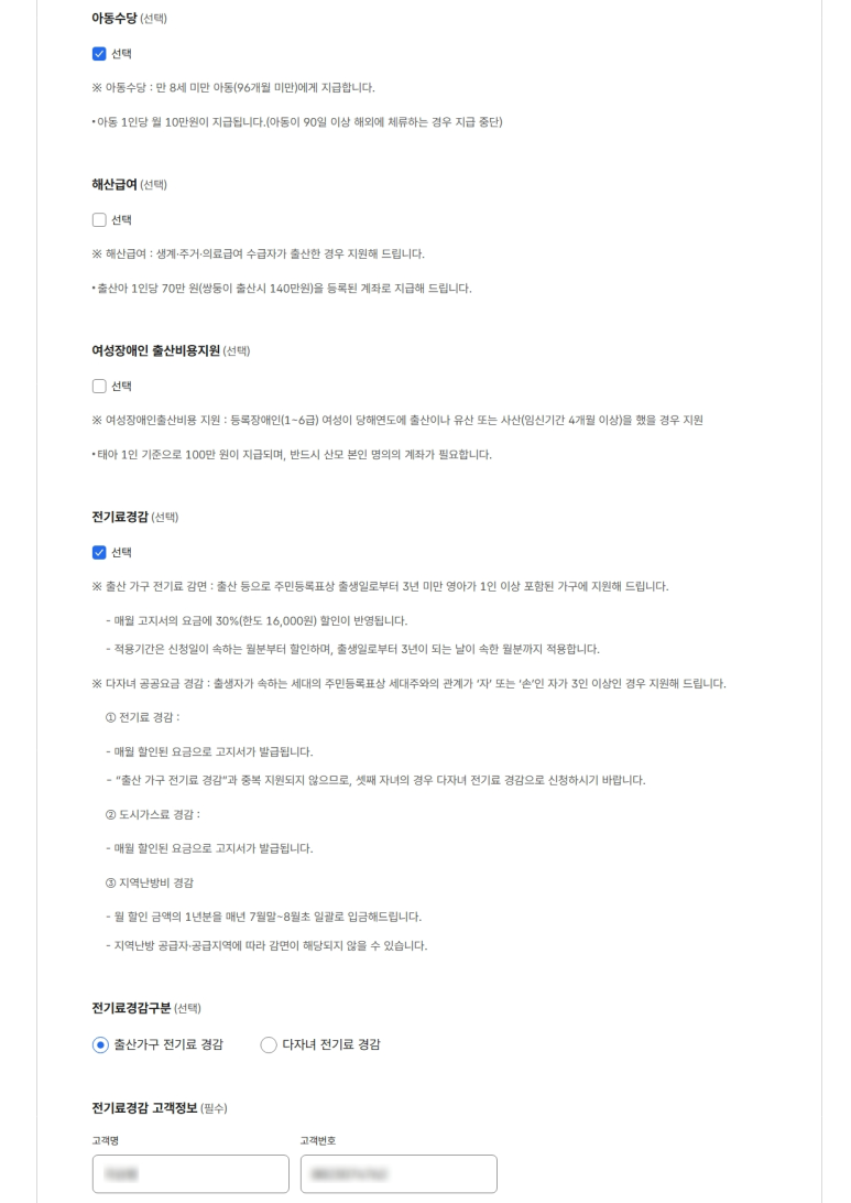 저는 아동수당과 전기료 경감 ( 출산가구 전기료 경감) 선택했어요.