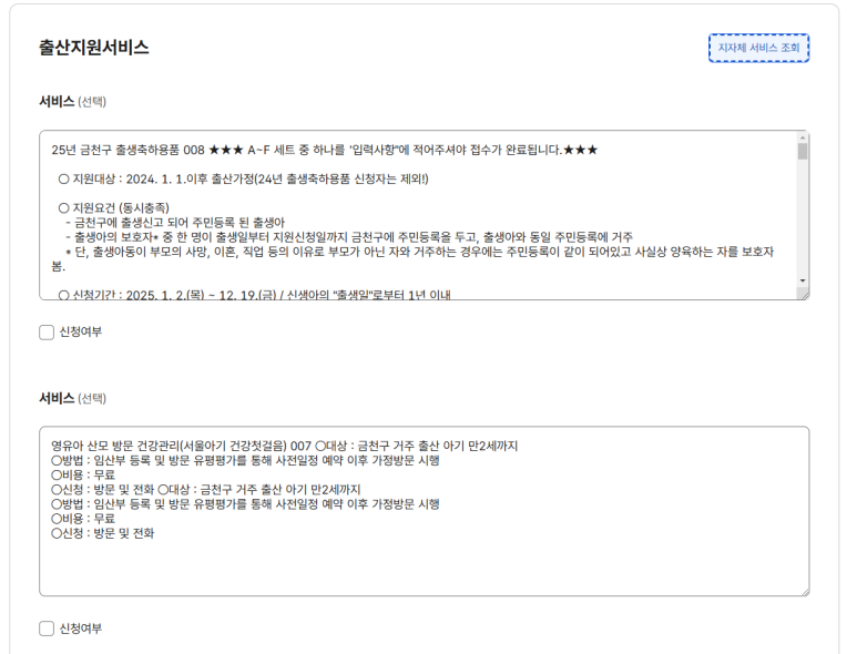 마지막 출산지원서비스 우측 지자체 서비스 조회 클릭하시면 거주하시는 곳 출생축하용품 등 확인하시어 신청 가능합니다!